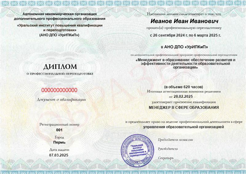 Курс обучения Менеджмент в образовании: обеспечение развития и эффективности деятельности образовательной организации (620ч)