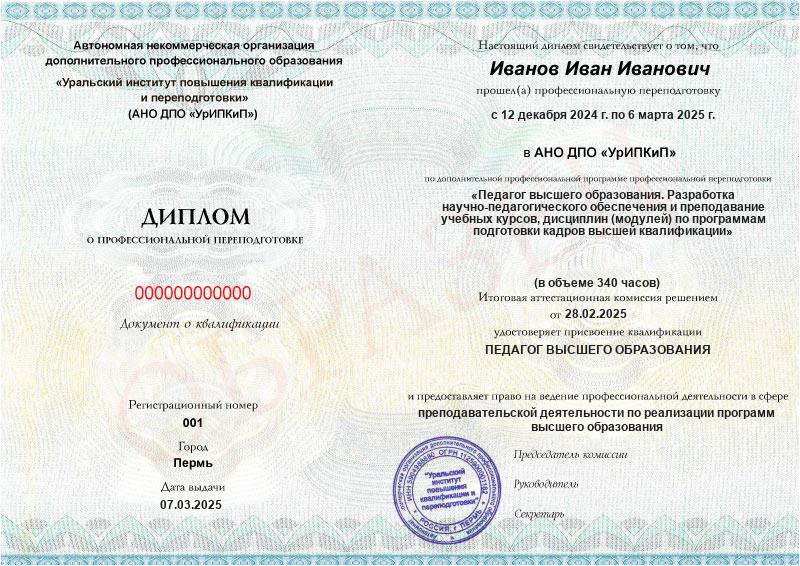Да, дипломы и удостоверения оформляются в соответствии с действующим законодательством РФ. Документы печатаются на специальных бланках, заверяются печатью АНО ДПО «УрИПКиП».