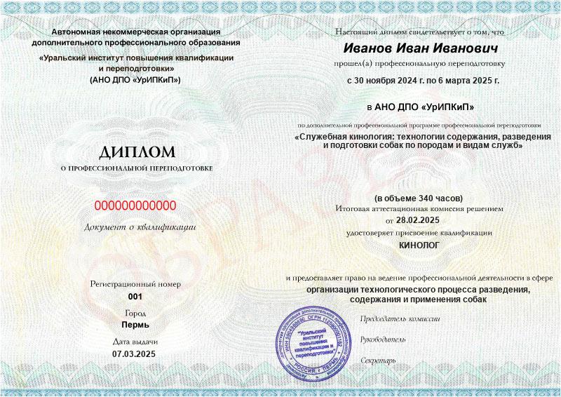 • Диплом о профессиональной переподготовке с присвоением квалификации «Кинолог». Вносится в Федеральный реестр документов об образовании.