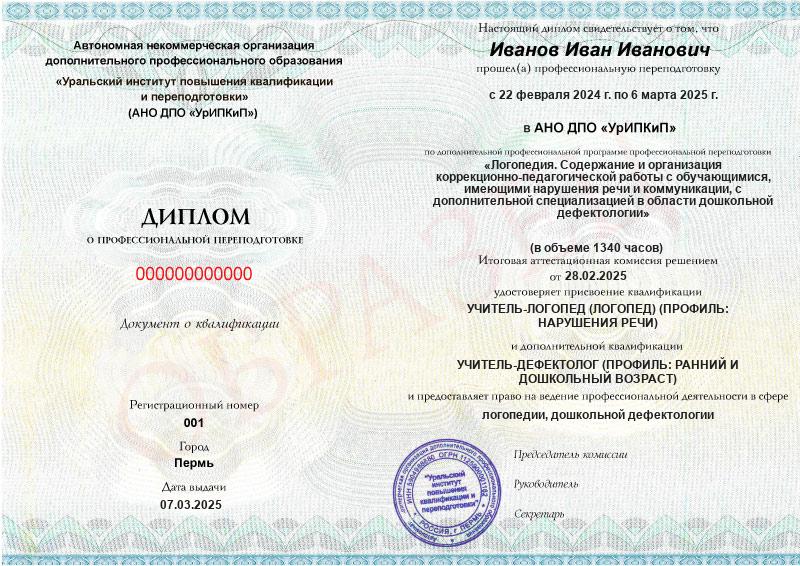 - 2 квалификации: Учитель-логопед (логопед) (профиль: нарушения речи) + Учитель-дефектолог (профиль: ранний и дошкольный возраст)