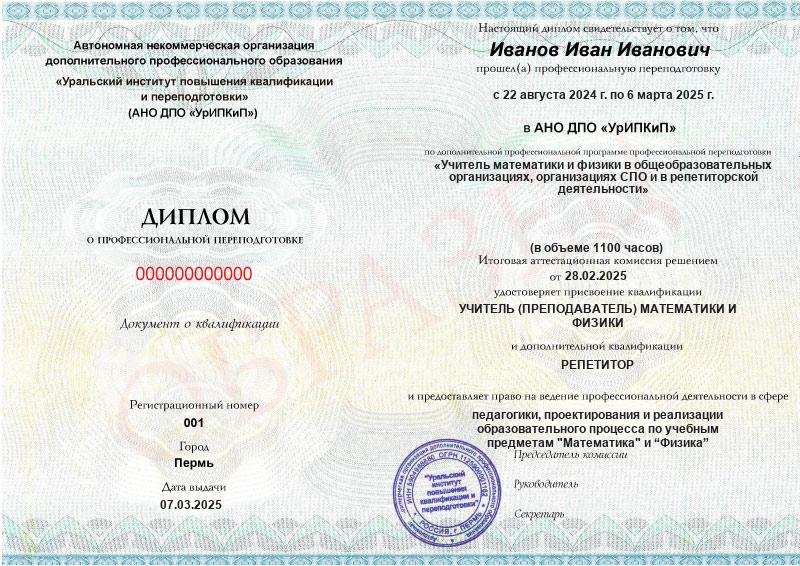 - 2 квалификации: Учитель (преподаватель) математики и физики + Репетитор